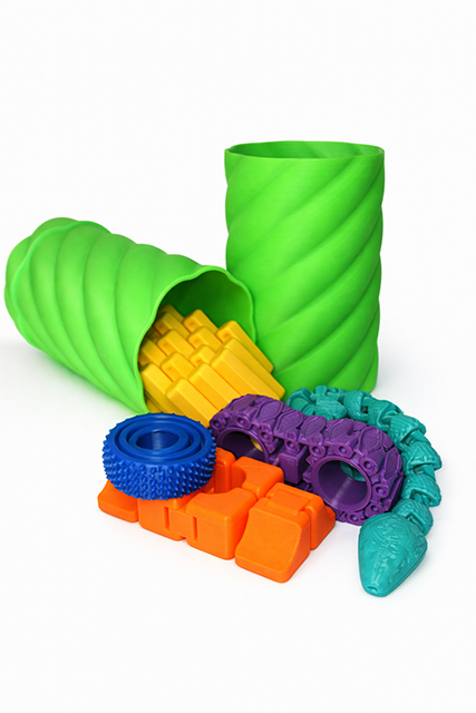 - This 3D printed fidget set is hand-sized, fitting perfectly in your pencil case.